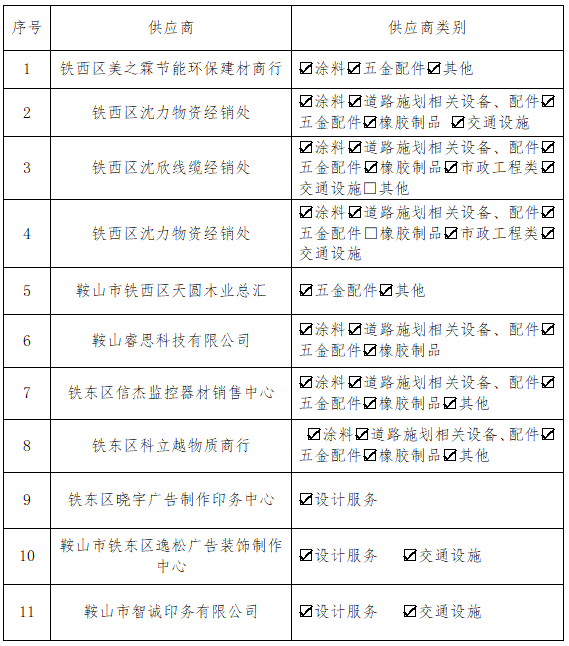 根據(jù)2024年5月11日發(fā)布的《供應商入庫公告》要求,經(jīng)過報名篩選和資質(zhì)審查等程序,確定了11家供應商符合入庫條件。現(xiàn)公布經(jīng)過篩選的供應商入庫清單,名單如下: